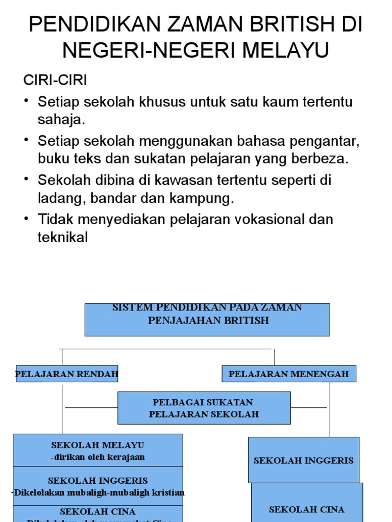 Sejarah pendidikan semasa penjajahan british. Kesan daripada peperangankerajaan british mengubah. Ciri-ciri umum pendidikan ialah.